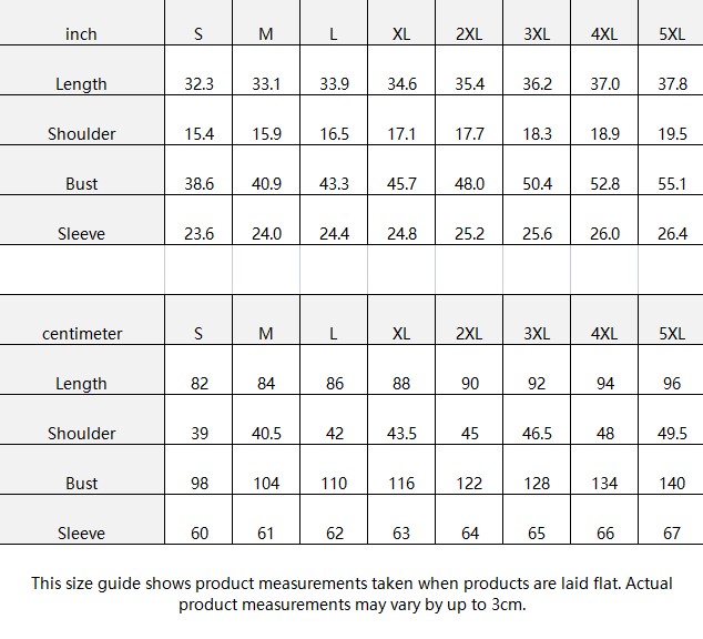 centimeter | S | M | L | XL | 2XL | 3XL | 4XL | 5XL |