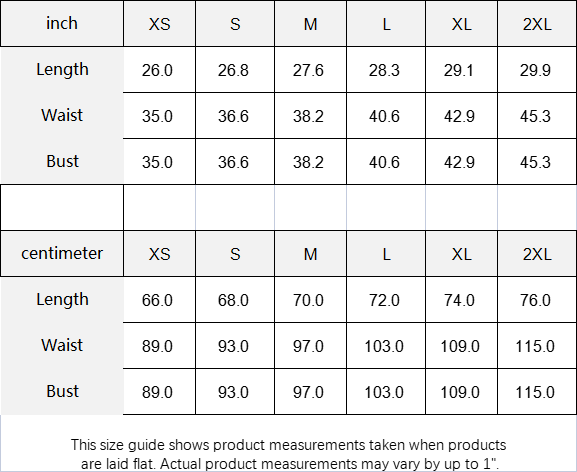 This size guide shows product measurements taken when products are laid flat. Actual product measurements may vary by up to 1″.