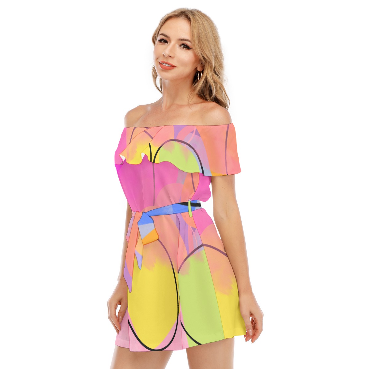 • Off-shoulder, waist string, ruffle edgm