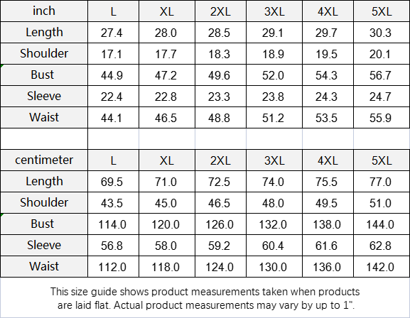 inch | L | XL | 2XL | 3XL | 4XL | 5XL |