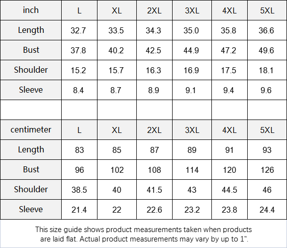inch | L | XL | 2XL | 3XL | 4XL | 5XL |