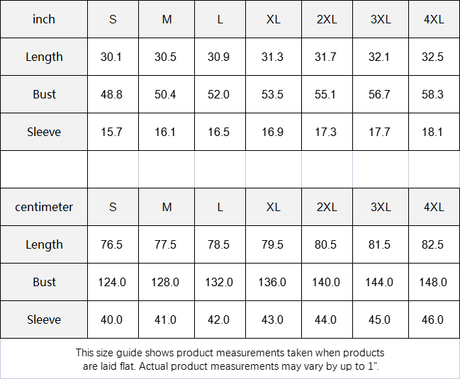 inch | S | M | L | XL | 2XL | 3XL | 4XL |
