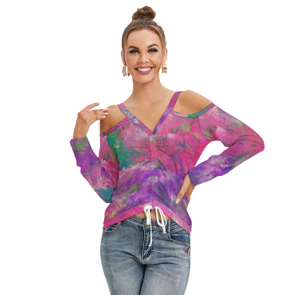 • V-neck, cold shoulder, long sleeve, decorative drawstring