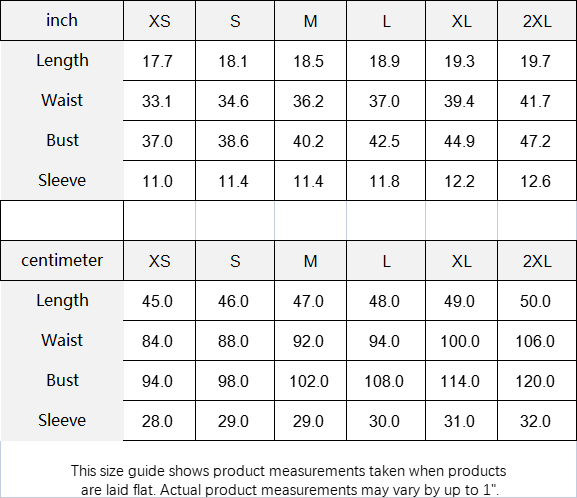 This size guide shows product measurements taken when products are laid flat. Actual product measurements may vary by up to 1″.