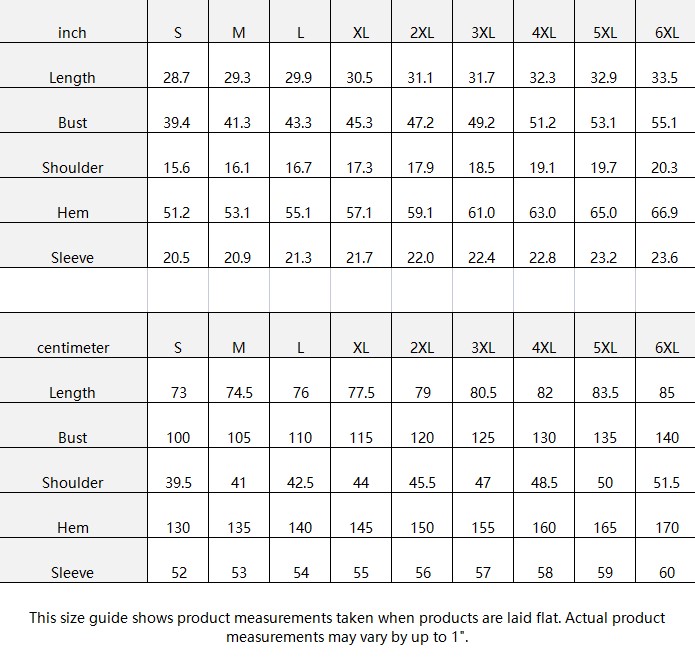 inch S M L XL 2XL 3XL 4XL 5XL 6XL