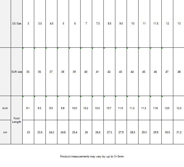 | US Size | 3 | 3.5 | 4.5 | 5 | 6 | 7 | 7.5 | 8.5 | 9.5 | 10 | 11 | 11.5 | 12 | 13 | |